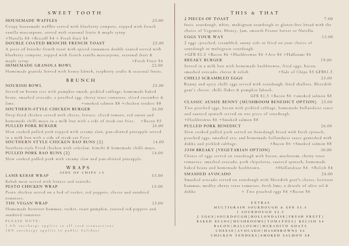 fruit, sourdough, white, multigrain sourdough with the choice of vegemite, honey, jam, peanut butter or Nutella